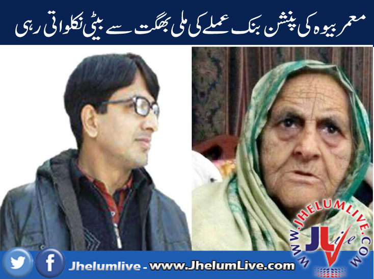 تفصیلات کے مطابق جہلم چونترہ کی رہائشی بیوہ معمر خاتون غلام کبریٰ نے اخبار نویسوں سے گفتگو کرتے ہوئے بتایا کہ میرا خاوند ریلوے میں بطور پینٹر سکھر سے ریٹائرڈ ہوا اس طرح ہم لوگوں نے جہلم سکونت اختیار کر لی، گزشتہ برس 5 مئی 2016 ء کو میرا خاوند رضائے الہٰی سے وفات پا گیا ، 6/7 ماہ گزرنے کے بعد جب میں نے خاوند کی پنشن کے حصول کے لئے ریلوے دفتر جہلم کی پنشن برانچ سے رابطہ کیا تو وہاں پر موجود اکاؤنٹٹنٹ شبیر نے 5 ہزار روپے رشوت طلب کی اور بتایا کہ کاغذات تیار کرکے سکھر بھجوا دونگا، اس طرح آپ کے خاوند کی پنش آپ کے نام منتقل ہو جائیگی، جب شبیر نامی ریلوے اہلکار نے پنشن ریکارڈ چیک کیا تو اس نے انکشاف کیا کہ آپ کا خاوند ابھی تک ریلوے ریکارڈ کے مطابق زندہ ہے ،اور ہر ماہ آپ کے خاوند محمد بچل کی پنشن وصول کی جارہی ہے ،جس پر مجھے حیرانگی ہوئی میں نے یونائیٹڈ بنک ٹاہلیانوالہ میں رابطہ کیا تو بنک مینجر بلال احمد نے مجھے مطمئن کرنے کی بجائے ٹرخا دیا، اس طرح ریلوے ملازمین کی رہنمائی کرنے پر میں اپنا پنشن کا کیس تیار کروا کے سکھر چلی گئی، سکھر ریلوے کے شعبہ پنشن نے میرا کیس مکمل کر کے میرے خاوند کی پنشن میرے نام پر منتقل کر دی،