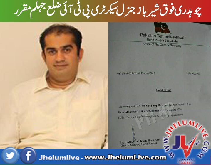 چوہدری فوق شیر باز جنرل سیکرٹری پی ٹی آئی ضلع جہلم مقرر