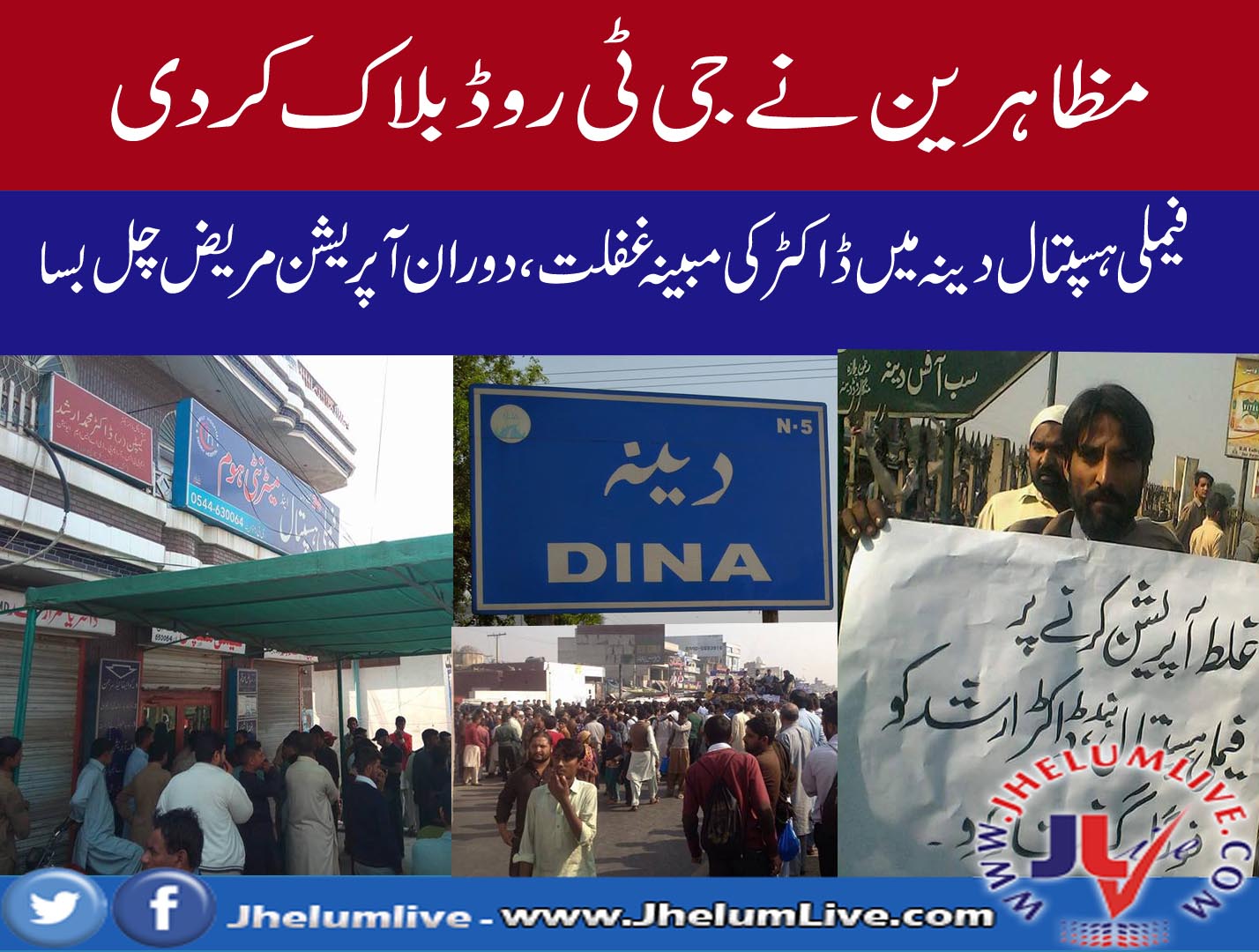 اس حوالے سے مظاہرین نے احتجاج کرتے ہوئے صبح سویرے جی ٹی روڈ دینہ کو بلاک کردیا۔ مظاہرین کا کہنا ہے کے انتظامیہ فوری طور پر اسپتال کو سیل کرے اور ڈاکٹر ارشد کو گرفتار کر کے قرار واقعی سزا دی جائے.